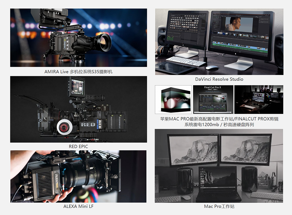 Prime電影定焦鏡頭、配備4K高(gāo)清攝影機的(de)航拍(pāi)無人(rén)機(大(dà)疆系列)、德國進口镝燈燈組、斯坦尼康減震器(qì)、電影級錄音(yīn)收音(yīn)設備,以及後期MAC STUDIO全高(gāo)清工(gōng)作站和(hé)好萊塢影視級别達芬奇調色系統。